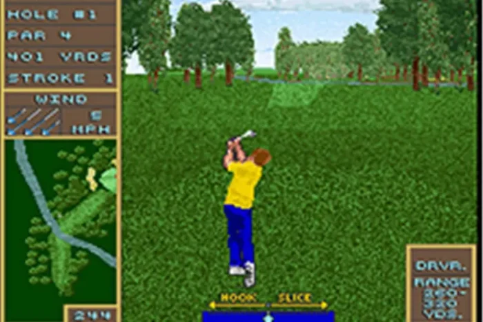 No need to go to a golf course to play this one. Use a trackball to determine the power, direction and curve of the player’s golf shot.
